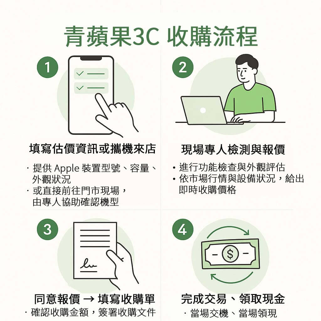 - 問現金價:用 LINE 傳「型號/容量/電池健康/外觀瑕疵」獲取現金價(60 秒出價)。